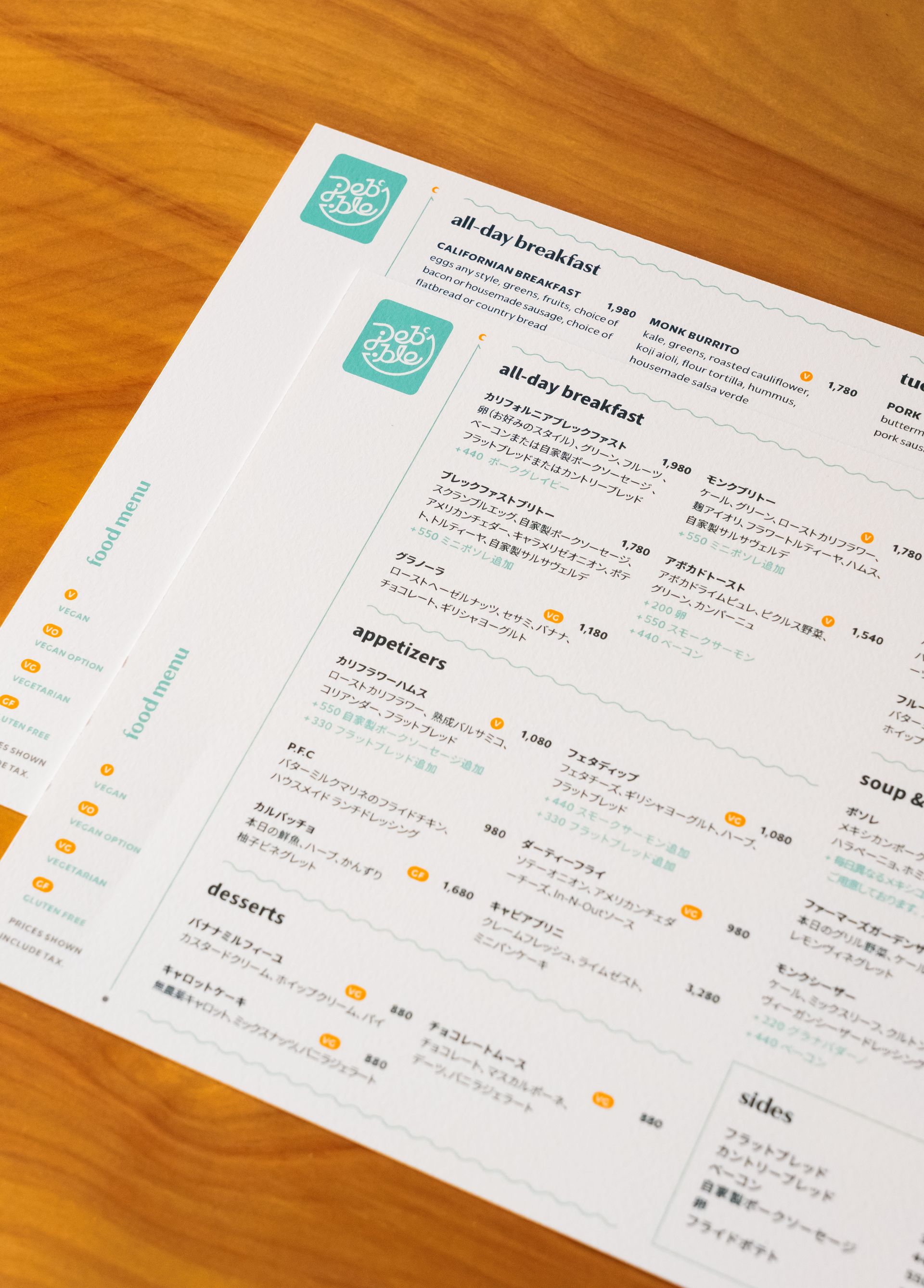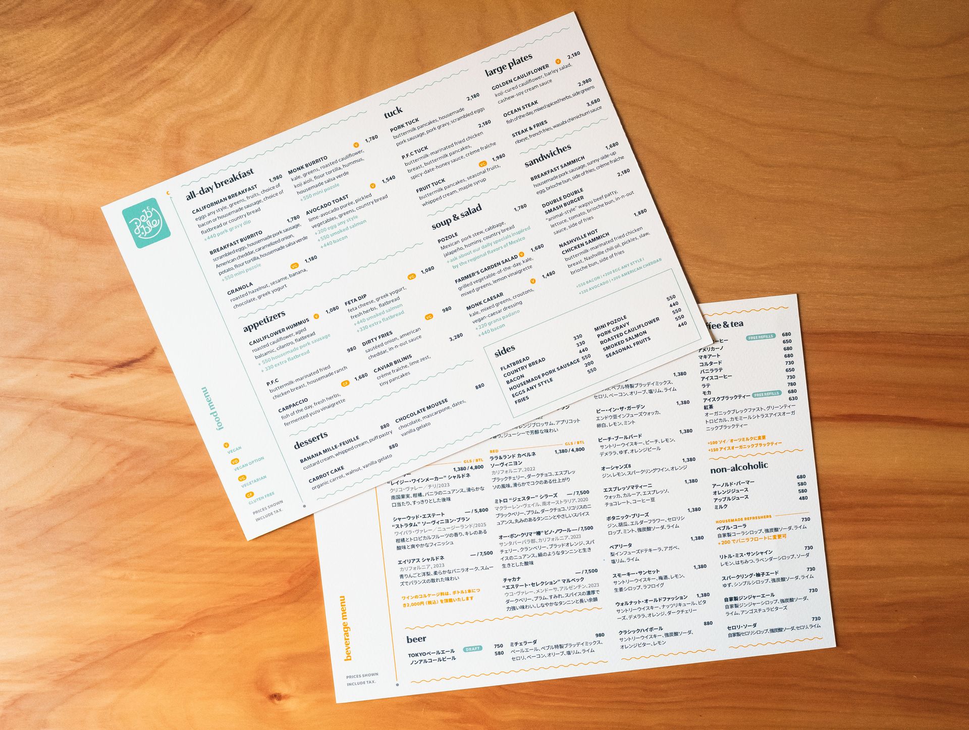 For a restaurant, the menu design is arguably the most important deliverable. Clear, well-organized design with strong hierarchy are essential elements of menu design. Customers must be able to quickly and easily parse through many menu items to determine what they would like. While being clear and information-driven, the design must also be visually engaging. Further adding to this challenge, the menu needed to be designed as bilingual for both English-speaking and Japanese patrons. The typefaces and layout design had to be carefully considered to keep the design visually appealing, cohesive, and legible across both versions of the menu, connecting with all customers regardless of language barriers.